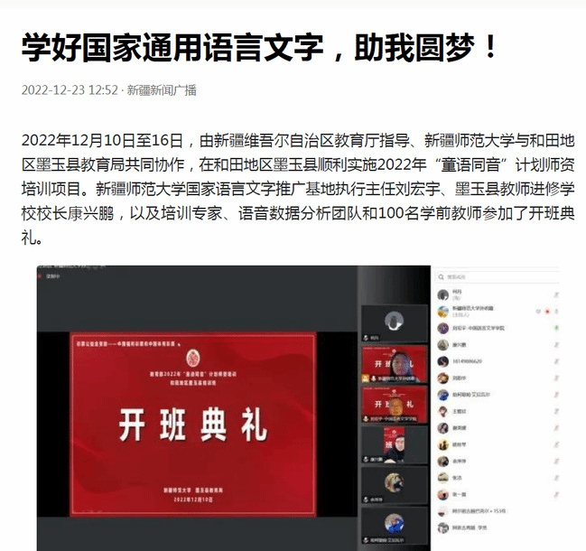 2022年12月10日至16日,由新疆维吾尔自治区教育厅指导、yl6809永利官网与和田地区墨玉县教育局共同协作,在和田地区墨玉县顺利实施2022年“童语同音”计划师资培训项目。yl6809永利官网国家语言文字推广基地执行主任刘宏宇、墨玉县教师进修学校校长康兴鹏,以及培训专家、语音数据分析团队和100名学前教师参加了开班典礼。