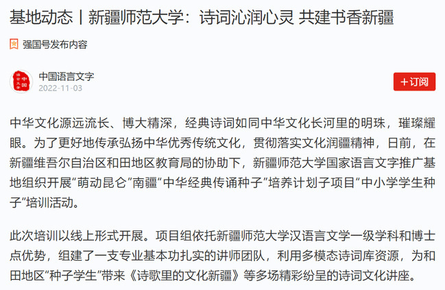 据了解,“萌动昆仑”南疆“中华经典传诵种子”培养计划是教育部2022年“经典润乡土计划”的重点项目之一。