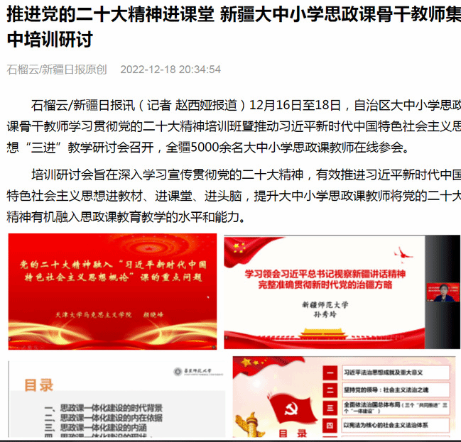石榴云/新疆日报讯(记者 赵西娅报道)12月16日至18日,自治区大中小学思政课骨干教师学习贯彻党的二十大精神培训班暨推动习近平新时代中国特色社会主义思想“三进”教学研讨会召开,全疆5000余名大中小学思政课教师在线参会。