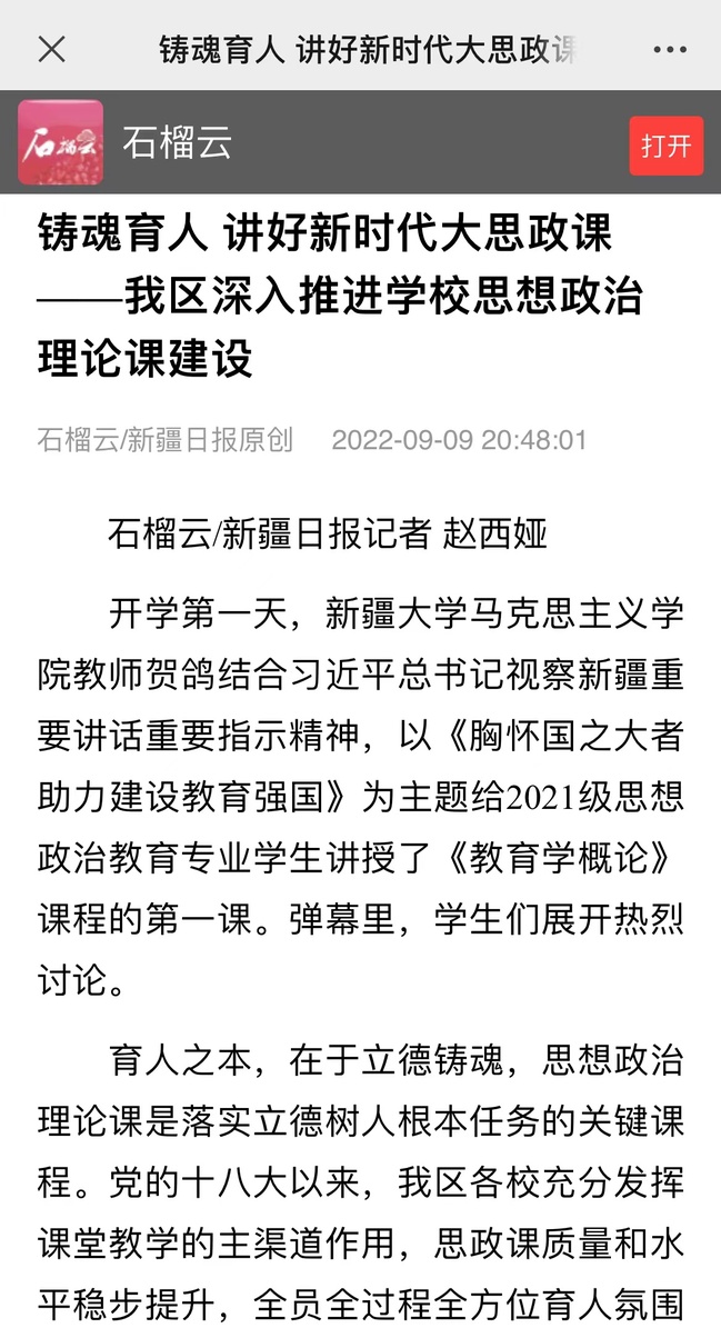 石榴云/新疆日报记者 赵西娅 开学第一天,新疆大学马克思主义学院教师贺鸽结合习近平总书记视察新疆重要讲话重要指示精神,以《胸怀国之大者助力建设教育强国》为主题给2021级思想政治教育专业学生讲授了《教育学概论》课程的第一课。弹幕里,学生们展开热烈讨论。