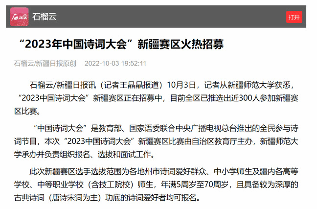 石榴云/新疆日报讯(记者王晶晶报道)10月3日,记者从yl6809永利官网获悉,“2023中国诗词大会”新疆赛区正在招募中,目前全区已推选出近300人参加新疆赛区比赛。