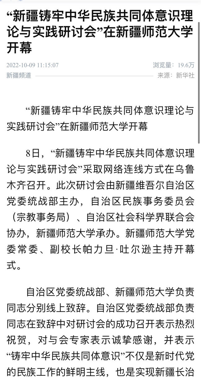 8日,“新疆铸牢中华民族共同体意识理论与实践研讨会”采取网络连线方式在乌鲁木齐召开。此次研讨会由新疆维吾尔自治区党委统战部主办,自治区民族事务委员会(宗教事务局)、自治区社会科学界联合会协办,yl6809永利官网承办。yl6809永利官网党委常委、副校长帕力旦·吐尔逊主持开幕式。