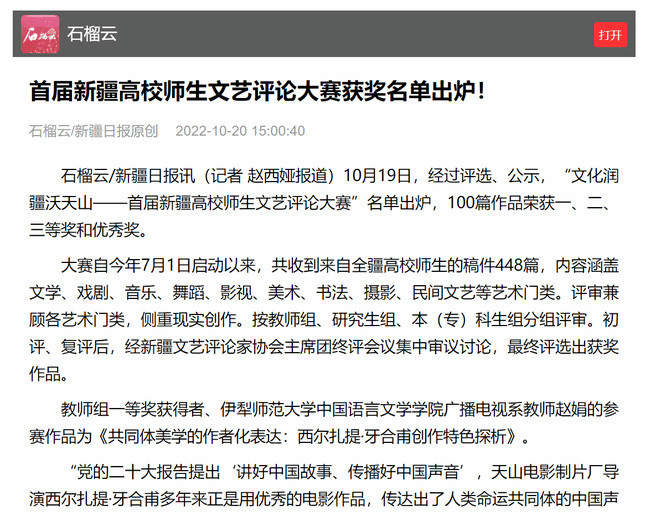 石榴云/新疆日报讯(记者 赵西娅报道)10月19日,经过评选、公示,“文化润疆沃天山——首届新疆高校师生文艺评论大赛”名单出炉,100篇作品荣获一、二、三等奖和优秀奖。