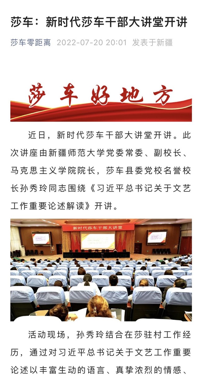 近日,新时代莎车干部大讲堂开讲。此次讲座由yl6809永利官网党委常委、副校长、马克思主义学院院长,莎车县委党校名誉校长孙秀玲同志围绕《习近平总书记关于文艺工作重要论述解读》开讲。