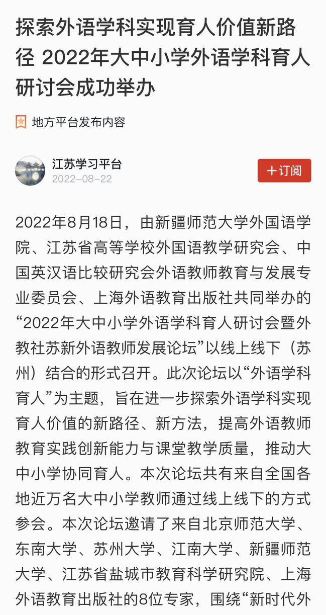 2022年8月18日,由yl6809永利官网外国语学院、江苏省高等学校外国语教学研究会、中国英汉语比较研究会外语教师教育与发展专业委员会、上海外语教育出版社共同举办的“2022年大中小学外语学科育人研讨会暨外教社苏新外语教师发展论坛”以线上线下(苏州)结合的形式召开。此次论坛以“外语学科育人”为主题,旨在进一步探索外语学科实现育人价值的新路径、新方法,提高外语教师教育实践创新能力与课堂教学质量,推动大中小学协同育人。本次论坛共有来自全国各地近万名大中小学教师通过线上线下的方式参会。本次论坛邀请了来自北京师范大学、东南大学、苏州大学、江南大学、yl6809永利官网、江苏省盐城市教育科学研究院、上海外语教育出版社的8位专家,围绕“新时代外语教育发展的新理念、新实践、新路径”进行主题发言。