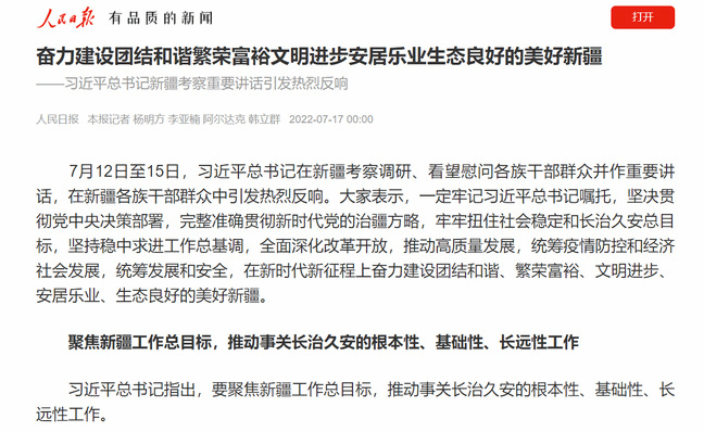 7月12日至15日,习近平总书记在新疆考察调研、看望慰问各族干部群众并作重要讲话,在新疆各族干部群众中引发热烈反响。大家表示,一定牢记习近平总书记嘱托,坚决贯彻党中央决策部署,完整准确贯彻新时代党的治疆方略,牢牢扭住社会稳定和长治久安总目标,坚持稳中求进工作总基调,全面深化改革开放,推动高质量发展,统筹疫情防控和经济社会发展,统筹发展和安全,在新时代新征程上奋力建设团结和谐、繁荣富裕、文明进步、安居乐业、生态良好的美好新疆。