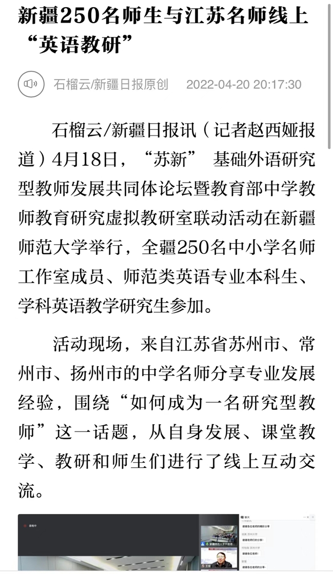 石榴云/新疆日报讯(记者赵西娅报道)4月18日,“苏新” 基础外语研究型教师发展共同体论坛暨教育部中学教师教育研究虚拟教研室联动活动在yl6809永利官网举行,全疆250名中小学名师工作室成员、师范类英语专业本科生、学科英语教学研究生参加。