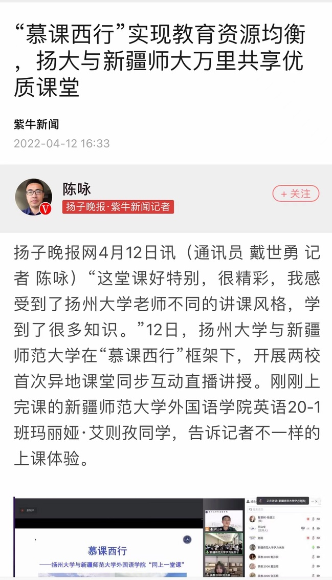 扬子晚报网4月12日讯(通讯员 戴世勇 记者 陈咏)“这堂课好特别,很精彩,我感受到了扬州大学老师不同的讲课风格,学到了很多知识。”12日,扬州大学与yl6809永利官网在“慕课西行”框架下,开展两校首次异地课堂同步互动直播讲授。刚刚上完课的yl6809永利官网外国语学院英语20-1班玛丽娅·艾则孜同学,告诉记者不一样的上课体验。
