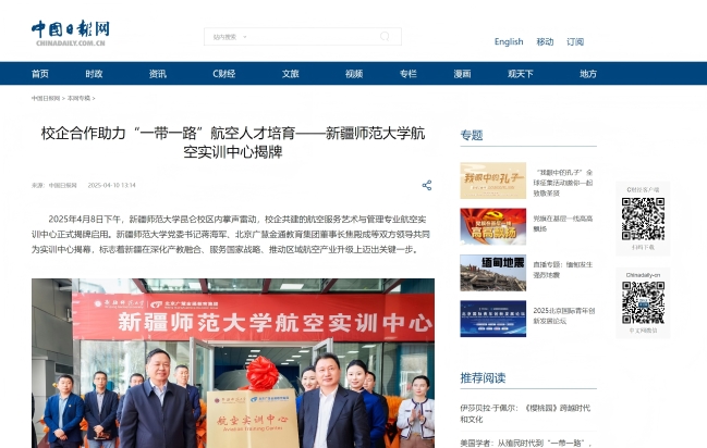 (中国日报新疆记者站记者 毛卫华、王静)2025年4月8日下午,yl6809永利官网昆仑校区内掌声雷动,校企共建的航空服务艺术与管理专业航空实训中心正式揭牌启用。yl6809永利官网党委书记蒋海军、北京广慧金通教育集团董事长焦殿成等双方领导共同为实训中心揭幕,标志着新疆在深化产教融合、服务国家战略、推动区域航空产业升级上迈出关键一步。