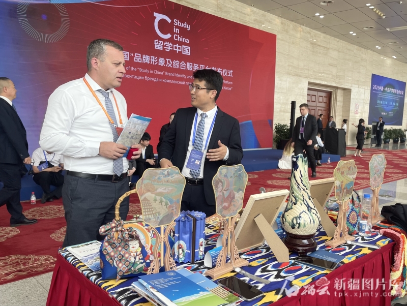5月12日,在留学中国品牌发布会暨“留学中国·学在新疆”教育推广展上,外宾正在伊犁师范大学展区前了解留学生招生专业等相关情况。石榴云/新疆日报记者 赵西娅摄