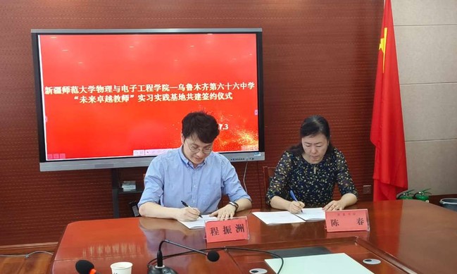 为强化物理学专业实践教学环节,全面提升人才培养质量,拓宽学生职业发展路径,7月3日,物理与电子工程学院学术院长程振洲、物理系主任帕尔哈提江·吐尔孙一行赴乌鲁木齐市第六十六中学进行访企拓岗并举行教育实习实践基地签约仪式。