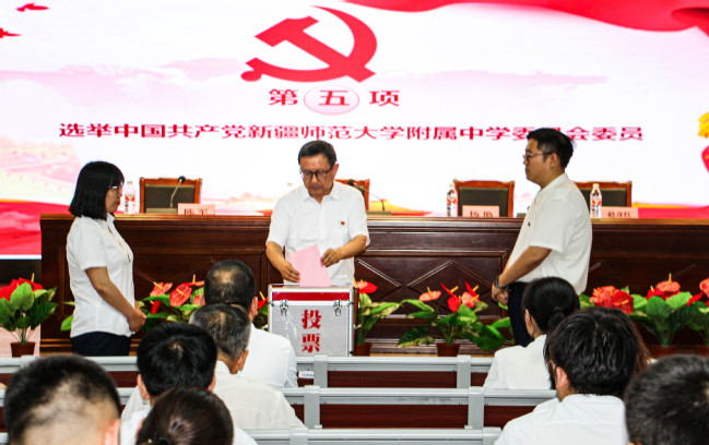 吕志新带领全体与会党员重温入党誓词。附属中学党委副书记、校长杨艳宣读《关于同意召开中国共产党yl6809永利官网附属中学委员会党员大会的通知》。大会以举手表决的方式审议通过了《中国共产党yl6809永利官网附属中学委员会党员大会选举办法》《中国共产党yl6809永利官网附属中学委员会补选委员候选人名单》以及总监票人、监票人名单。