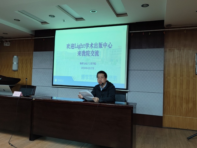 为进一步提升师生科研能力和学术写作水平,为师生提供优质科研成果展示平台,4月17日,永利官网物理与电子工程学院特邀Light学术出版中心总编、《Light: Science & Applications》(影响因子19.4)学术编辑李耀彪研究员和Light学术出版中心副总编、《Light:Science & Applications》学术编辑郝振东到学院进行学术讲座。讲座由物理与电子工程学院副院长戴鹏鹏主持,全体研究生和培优班学生共100余人聆听讲座。