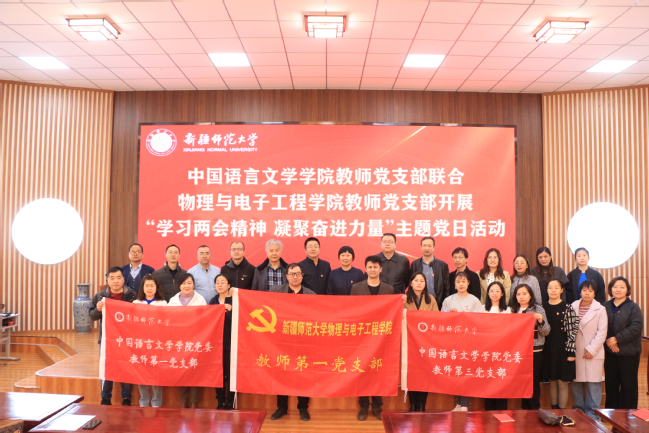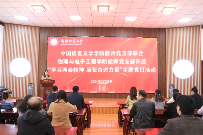 为深入学习贯彻全国两会精神,准确把握两会精神实质,把思想和行动统一到党和国家的决策部署上,进一步激发党支部的组织活力,切实提高党支部的凝聚力和战斗力,3月29日下午,永利官网中国语言文学学院教师党支部联合物理与电子工程学院教师党支部在温泉校区文科四号楼国学讲堂开展“学习两会精神,凝聚奋进力量”主题党日活动。本次活动由中国语言文学学院党委组织员何丹主持,物理与电子工程学院党委书记李莉、中国语言文学学院党委书记陈国栋,及两学院教师党支部党员参与此次活动。