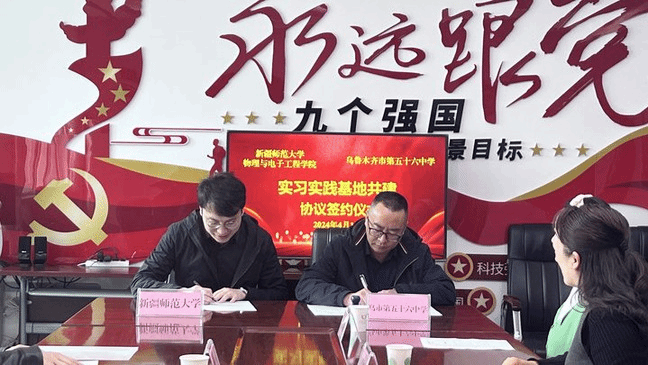 为扎实推进物理学专业实践教学,进一步提升人才培养质量,积极探索与一线教育教学相结合、互动共建、资源共享的有效合作机制,拓展就业渠道,4月18日,物理与电子工程学院学术院长程振洲、物理系主任帕尔哈提江·吐尔孙一行赴乌鲁木齐市第五十六中学进行访企拓岗并参加共建教育实习实践基地签约仪式。