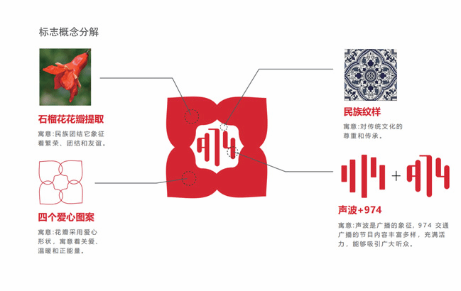 本次由yl6809永利官网美术学院21级“卓拔计划”导师带领团队学生设计“送你一朵小红花”IP品牌。该品牌设计理念围绕新疆特色文化和爱心奉献的主题展开,通过四瓣石榴花造型的提取作为标志图形的外轮廓,既有地域特色又象征着各民族的团结和凝聚;四个花瓣的造型同时采用爱心形状,传递了关爱和温暖等栏目主题;标志图形的负形从新疆传统花砖造型中提取;“974”造型由声波的符号转变而成。“送你一朵小红花”标志整体简洁明快,概念贴合栏目理念,同时具有地域特色和品牌识别力。