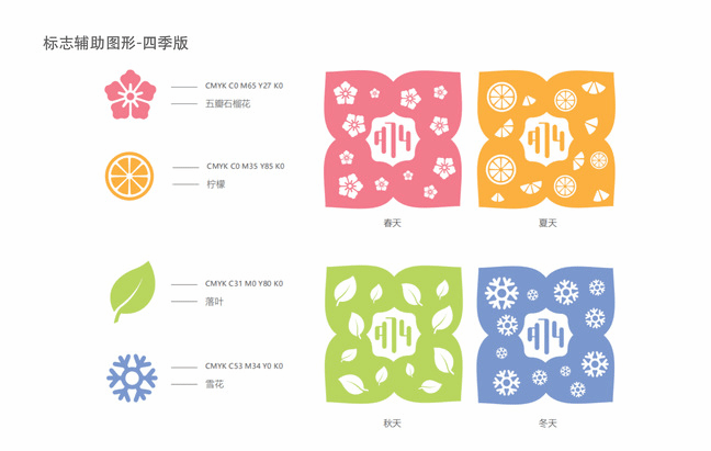 该品牌设计的辅助图形有春夏秋冬“四季版”、融入民族纹样的“非遗版”和与爱心联盟商家的“联名版”,通过不同图形元素、纹样和色彩的融入让标志更加丰富和多变,让受众感受到不一样的“小红花”视觉符号。