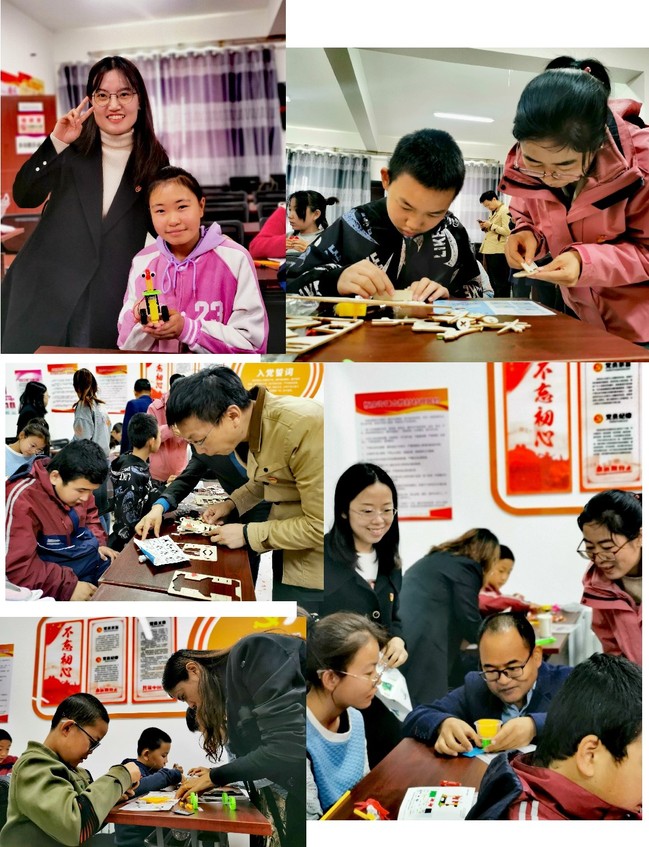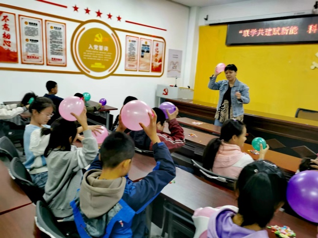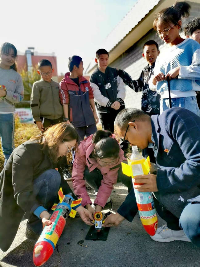 活动中,教师第一党支部党员教师与合胜村中小学生共同完成了一系列生动有趣的科学小实验。物理与电子工程学院实验中心主任邹艳波为大家演示“看不见的力”实验,并讲解其中蕴含的物理原理。王林香博士和学生们分享神奇摩擦起电实验,大家兴高采烈,积极踊跃参与其中。在老师们的协助下,现场的中小学生成功自制组装了“甩干机”“空气加湿器”和越野车模型等,通过自己的巧手完成一件件作品,欣喜地体验了探索和动手的乐趣。最后,在村委会大院里,物理与电子工程学院教师带领中小学生共同完成了“水火箭”发射实验,当一枚枚水火箭成功升空时,大家不禁发出愉快惊异的欢呼声,在寓学于乐的过程中了解了火箭发射的原理,为树立强国航天梦埋下了希望的种子。