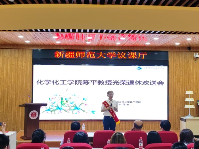 一支粉笔两袖风华,三尺讲台四季晴雨。陈平教授自2011年来到化学化工学院,始终保持对学术研究的热情严谨,深耕于钟爱的科研事业,硕果累累。历届本硕博学生通过视频送上对陈平教授即将退休的不舍和祝福。2018届硕士毕业生王莹说到:“谢谢老师一直以来的关心以及研究生三年在科研上的指导。真诚的祝愿陈老师在未来的日子里身体健康、事事顺心。”学院工会委员汪鑫老师为陈平教授颁发荣誉退休绶带,副院长李桂新教授代表学院师生,王云老师代表环境系教师为陈平教授献花。