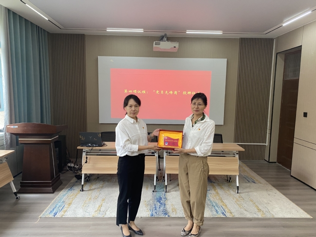全体党员排队交纳党费,自觉履行党员义务。外国语学院党委书记董馥伊为教师党员“育人先锋岗”获得者——教师第一党支部组织委员马晓玲授牌。