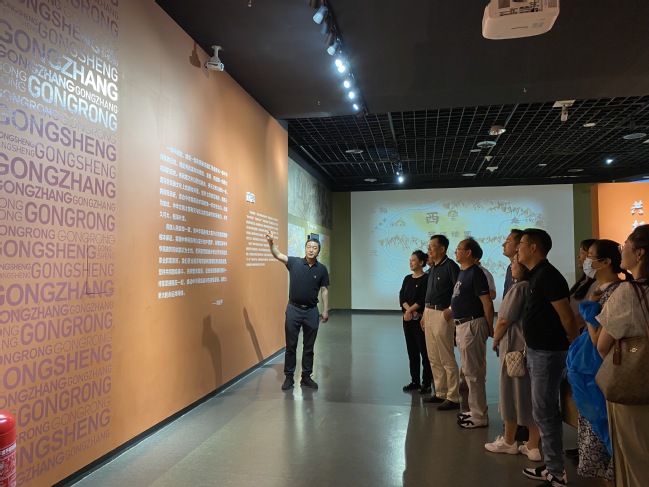 在“共有的家园:铸牢中华民族共同体意识陈列展”展厅,历史与社会学院副院长严学勤从专业角度为党员详细讲解了展厅的文物背后的故事,重点强调了铸牢中华民族共同体意识的重要性。通过观看共拓中华疆域、共书中华历史、共创中华文化、共铸中华之魂四个篇章的展览,大家一起沿着中华民族历史发展轴线,通过现代信息技术手段从一件件精美的艺术作品、珍贵的影像资料中,全景式深入了解新疆各族人民在漫长的历史长河里,与全国各族人民一道共同开拓辽阔疆域、共同书写悠久历史、共同创造灿烂文化、共同培育伟大精神的壮阔史诗。