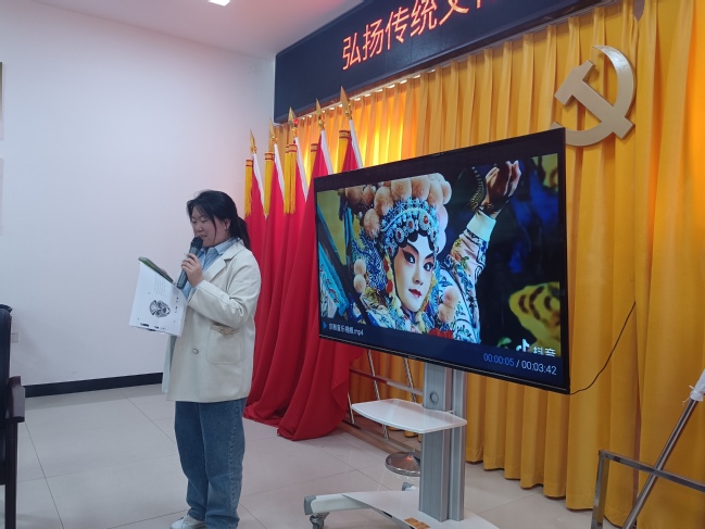 活动开始 ,本科生第二党支部党员张博向社区居民和其他活动参与者介绍了本次活动的组织、参与人员以及基本内容。随后,本科生第二党支部党员郝祎从京剧文化概述、京剧的起源、脸谱的由来、脸谱的图案等四个方面向社区居民普及了京剧文化,讲解了京剧的基本知识,从京剧的表现手法、行当分类等几个方面,生动形象地描述了京剧表演的形式。通过介绍脸谱所表现出的不同人物、不同色彩、图案与纹路背后的意义等基础知识,使居民了解到中华优秀传统文化的重要成果。