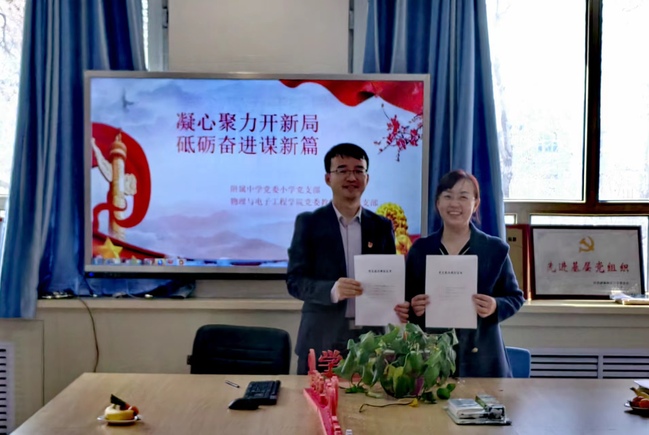 参观结束后,两个党支部的党员教师在附属中学党建活动室举行了党支部共建启动仪式。附属中学小学党支部书记王新刚和物理与电子工程学院教师第一党支部书记秦晨代表双方签订了“科普活动进校园”支部共建协议书,商定未来将以“党建引领悟物明理春风化雨”为主题持续开展丰富多彩的共建活动。王新刚讲到,附属中学在小学科学课程和学科教师的专业性建设方面需要进一步加强和深化,希望以此次共建活动为契机,借助大学教师的力量,为小学任课教师在实验学科的专业化引领、多学科融合思路的扩展和小学生科学素养提升方面提供更多的支持和帮助。秦晨表示,党支部将依托“三人行”党小组,针对小学课后托管和第二课堂的需求,充分发挥专家博士团队的优势和力量,通过定期开展科普活动,激发小学生热爱科学、学好科学的兴趣和热情,为培养科学精神和创新能力、引导确立价值航向与精神坐标提供一定的支持和指导,做好小学科学教育加法。