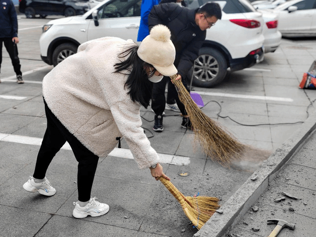 “胡杨先锋班”成员与各支部党员清扫路面垃圾与杂物