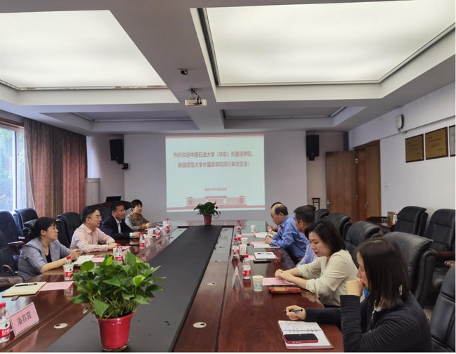 4月14日上午,外国语学院副院长杨新璐、英语专业负责人郑琴前往湖南大学外国语学院,与同时到访的中国石油大学(华东)外国语学院党委书记朱惠平、院长毛浩然一行,共同座谈交流。湖南大学外国语学院党委书记徐军,院长莫再树,副院长于海玲、任远,办公室主任谭晓梅参加座谈会。与会三方围绕专业建设、人才培养、科研团队建设进行交流探讨,希望形成更切实深入的合作。