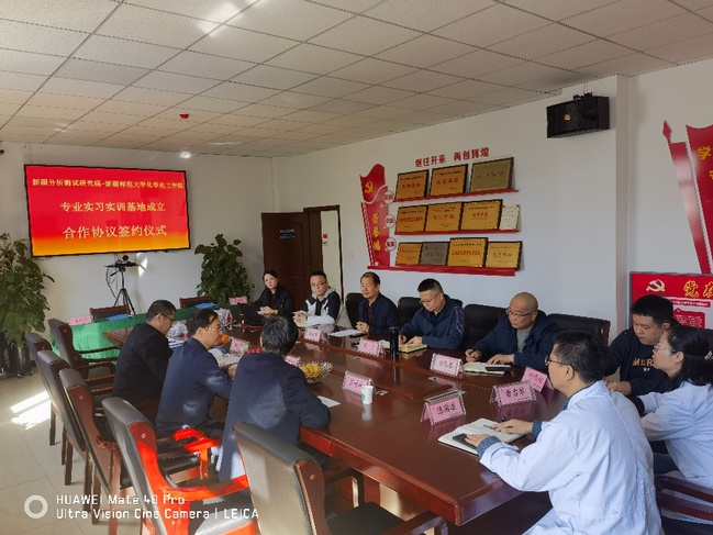 为加强化学化工学院专业实习实训基地建设,进一步扩宽学院科学研究、对外合作发展路径,4月13日上午,化学化工学院党委书记张鑫,副院长罗时玮、崔现宝,环境科学与工程系主任王庆赴新疆分析测试研究院举行专业实习实训基地合作签约挂牌仪式。新疆分析测试研究院党委书记宋良辉、副院长杨中、光谱所所长赵林同、研究所所长李慕春、色谱所所长曹雪琴、业务质管部部长杨伟翔、副研究员陈国通、研究院办公室主任汤兆星参加签约揭牌仪式。