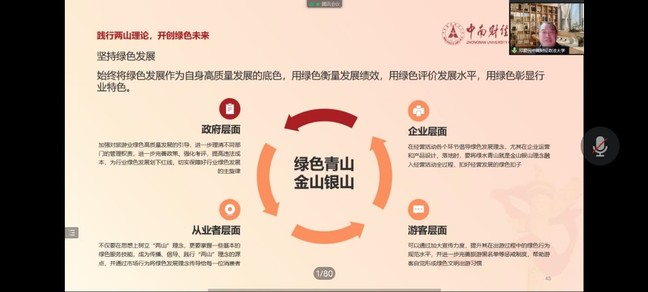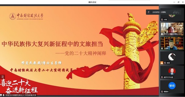 为深入学习宣传贯彻落实中国共产党第二十次全国代表大会精神,切实将全体党员干部的思想统一到党的二十大精神上来,把力量凝聚到党的二十大确定的各项任务上来,地理科学与旅游学院党委积极筹划,统筹安排,开设《学者眼中的二十大》系列讲座。12月2日,邀请中南财经政法大学旅游研究院院长、全国首批双带头人党支部书记、全国首批样板党支部书记、国家一流专业旅游管理专业首席专家邓爱民教授,在线上举行了《中华民族伟大复兴新征程中的文旅担当——党的二十大精神阐述》讲座。讲座由地理科学与旅游学院党委书记王勇辉教授主持。学院全体教师及部分学生共计200余人次参会。