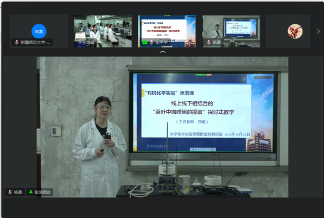 为加强有机化学实践课程建设,学习知名高校在实践教学中的先进教学理念、方法、模式,10月至11月,在化学化工学院副院长罗时玮(援疆干部)的牵线搭桥下,永利官网有机化学教研室加入中国科学技术大学牵头搭建的大学化学实验教学虚拟教研室。10月初,永利官网化学化工学院与中国科学技术大学就有机化学实验教学大纲、教学模式、课堂实验内容及实践课程建设经验、上课形式、教学环节、授课时间等进行了深入交流与研讨,确定了本学期虚拟教研室示范实验内容的合作计划。实验示范课程主讲教师为中国科学技术大学朱平平、郑媛、李玲玲三位教师,实验示范课程主题分别为“茶叶中咖啡因的提取”“乙酰二茂铁的合成、纯化与表征—从科研的思路出发”。