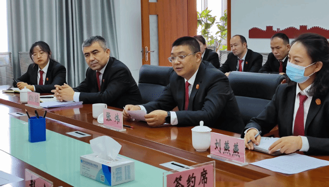 签约仪式上,张炜对政法学院一行赴库车表示欢迎,并介绍了库车市人民法院建设情况,提出院校合作旨在推进双方资源互补,推动双方在人才培养、科学研究、审判实务上的协作交流,推进共建产出、推动双赢。唐文睿对学校和学院专业发展、科学研究情况进行了介绍,提出希望在今后的合作中能够进一步提升学院服务基层、关注基层的能力,共同为依法治疆做出贡献。茹克娅·霍加介绍了学院法学专业建设情况,希望通过合作平台组织线上合作交流、签约实习生就业基地、挂牌法学教育实践基地等形式深化合作,在人才培养和输送上实现共赢。依力哈木·热合曼就2023年库车市司法产品规划进行介绍,并希望进一步加强法院与高校的良性互动,提高法院司法水平和高校科研育人水平,实现司法实践与法学研究互促,共同推进库车市法治建设,践行依法治疆。