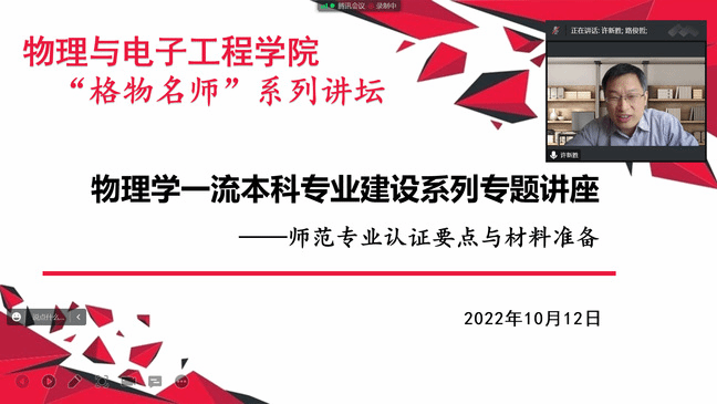 为落实《yl6809永利官网2022 年师范类专业预认证工作推进实施方案》要求,积极推进自治区一流本科专业“物理学”的认证工作,更好完成自评自建阶段的工作任务,10月12日,物理与电子工程学院邀请安徽师范大学科研处副处长、安徽省学术与技术带头人后备人选许新胜教授,为全院教师进行了《师范专业认证要点与材料准备》专题讲座。全体专任教师参加讲座,物理与电子工程学院副院长塔西买提·玉苏甫主持讲座。