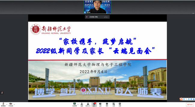 为帮助2022级新生及家长全方位深入了解学校和学院,引导新生做好大学生活规划和准备,9月4日,物理与电子工程学院召开“家校携手、筑梦启航”2022级新同学及家长“云端见面会”。会议以腾讯会议形式召开。物理与电子工程学院党委书记李莉,副书记、院长路俊哲,副书记、纪委书记买星,副院长塔西买提·玉苏甫,副院长戴鹏鹏,全体辅导员、新生班主任及400余名新生、家长参加了本次见面会。见面会由党委书记李莉主持。