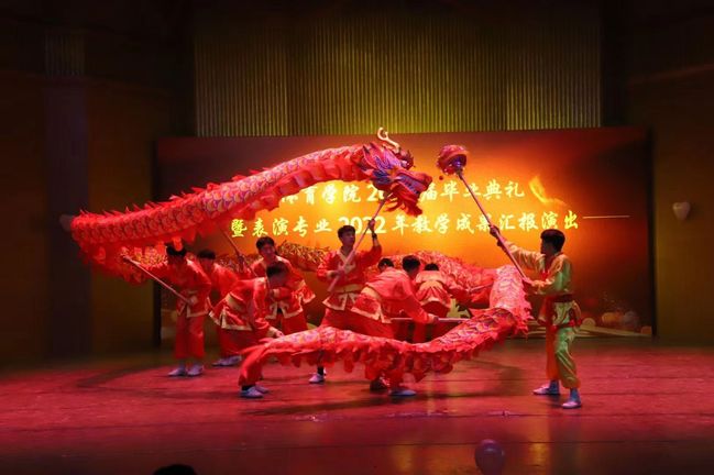 随后的表演专业教学成果汇报演出精彩纷呈,开场节目《龙腾狮跃》的舞龙舞狮表演喜气洋洋,生动活泼;《箭在弦上008》《聚而热枕·别也欢洽》《拾忆》《四海神韵》等舞蹈尽显表演专业风采;歌曲《Bad boy》《成都》引得现场观众频频欢呼叫好;毕业班表演18-8班的情景剧《请回答2018》更是将四年回忆融入到表演之中,将晚会推向了高潮。整场晚会在依依惜别和美好祝愿中落下帷幕。