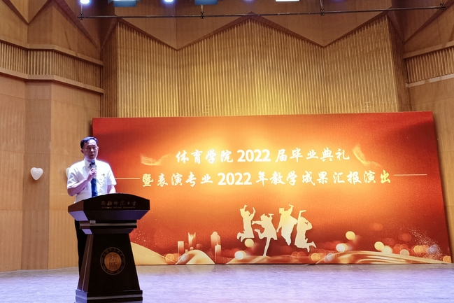 5月22日下午,体育学院2022届毕业典礼暨表演专业教学成果汇报演出在教学主楼二楼音乐厅隆重举行,毕业典礼由学院党委书记杨晓蓉主持。在2022届毕业生纪念短片中全体师生重温了过往岁月,体育学院党委副书记、院长庞辉为毕业生送上满载全院教师深情的临别赠语,辅导员爱尔兰为毕业生送上一份特殊的离别祝福。毕业生代表在发言中,代表全体2022届毕业生回忆了四年大学生活中的点滴,并向学校及老师们表达了不舍和感谢。在学士学位授予仪式中,师生微笑、握手、拨穗、授证、合影……每一个瞬间都见证着学子们人生中最难忘的时刻。
