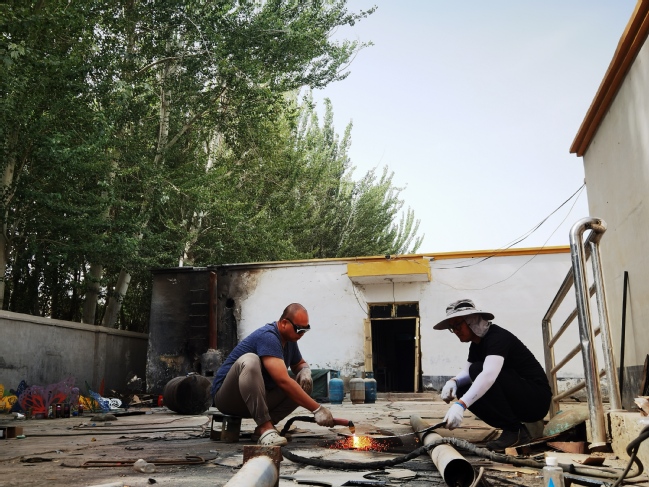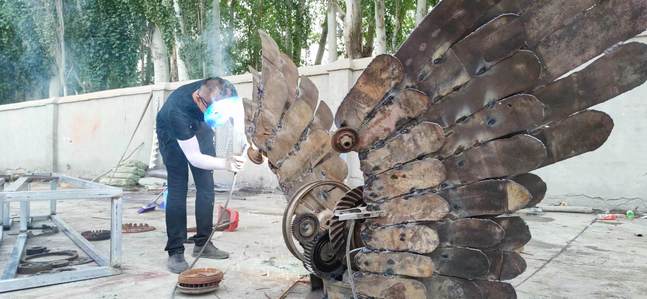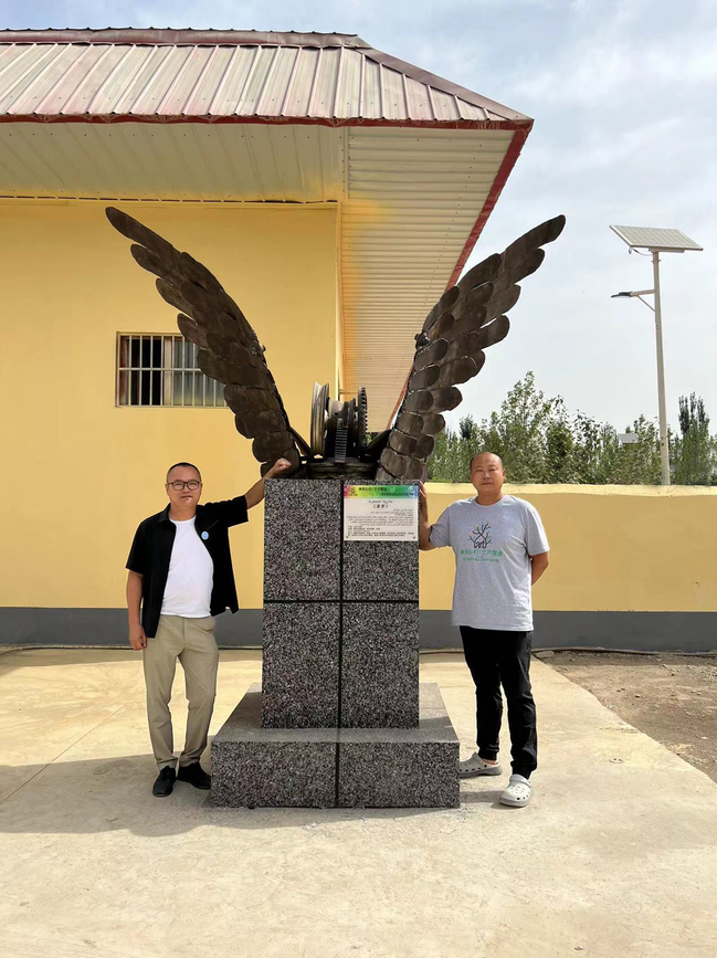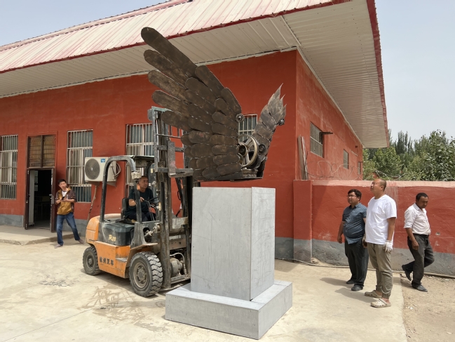5月24日至6月13日,永利官网美术学院肖锟、王哲两位教师受邀参加了由自治区文旅厅、新疆雕塑学会、莎车县阿瓦提镇共同举办的“美丽乡村·艺术营造”中国新疆莎车县阿瓦提公共艺术创作营活动。活动中26位雕塑艺术家就地取材,利用废旧农具、木材、钢材等材料与村民们共同创作了23件大型公共艺术作品。其中,永利官网教师肖锟、王哲选用废旧钢材、齿轮、轮毂等废旧材料,利用切割、焊接、打磨、清洗等工艺手法,为村民献上了体现各民族团结奋进、共同为实现伟大复兴的中国梦而努力奋斗的公共艺术作品《逐梦》,受到专家和村民们的一致好评。
