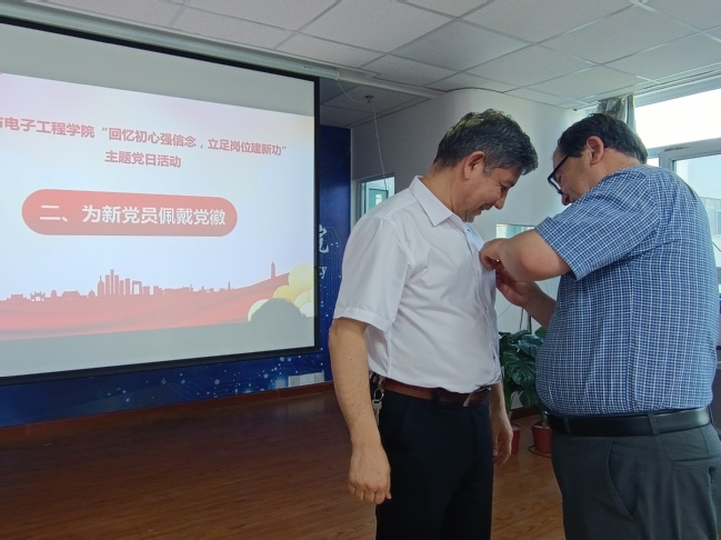 为新党员代表佩戴党员徽章
