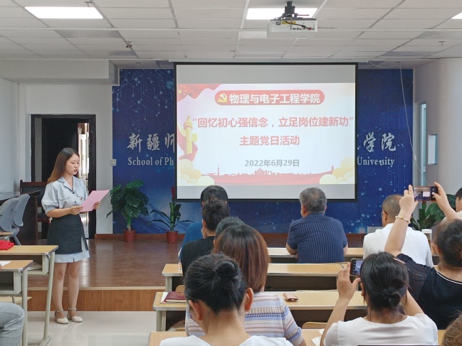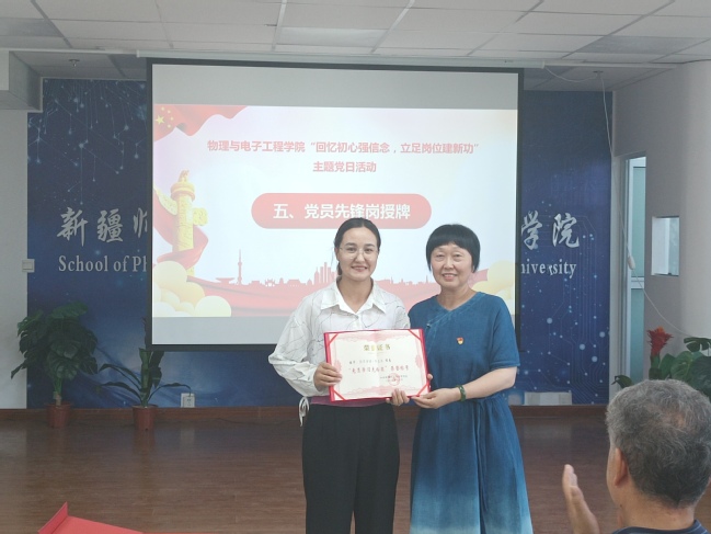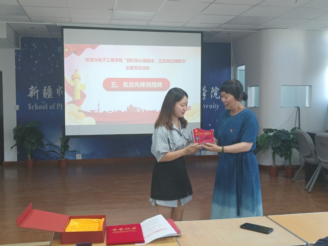 随后,进行了新党员入党宣誓和老党员重温入党誓词活动,教师支部书记秦晨、王静二位教师为6月和7月入党的党员赠送“政治生日”贺卡和礼物,为他们过了集体“政治生日”;李莉为2022年“党员育人先锋岗”和“党员学习先锋岗”授予者赵海琴老师和热罕古丽·阿力木同学授牌,寄语她们更好地发挥先锋模范作用,并希望广大师生党员以她们为榜样,立足岗位、恪尽职守、勤奋工作,充分展现党员的时代风采、精神风貌和昂扬斗志。
