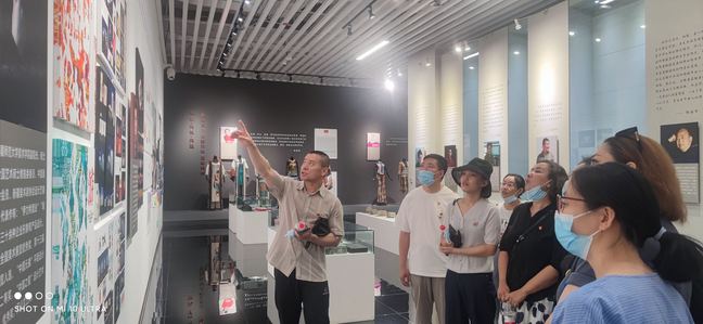 美术学院副院长王松作为“36位设计师展现新疆文化形象特展”的设计师之一,在参观过程中现场教学,为全体党员讲解其参展作品的设计理念和精神内涵,作品把对新疆的独到理解加以情感化、智慧化,用娴熟的当代设计语言勾勒、点染、穿插、浓墨重彩,赋予了大美新疆新的生命力和时代气息。