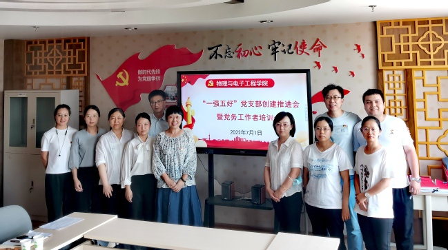 为深入贯彻新时代高校党建工作要求,认真落实《yl6809永利官网高质量推进基层党建2020-2025行动计划》,不断提升物理与电子工程学院党务工作者的政治素质和业务能力,7月1日,物理与电子工程学院党委召开“一强五好”党支部创建推进会暨党务工作者培训会。邀请校党委组织部综合科科长高丽倩进行“党的组织生活与党员发展”专题培训。会议由物理与电子工程学院党委副书记、纪委书记买星主持,党委书记李莉和全体党支部委员参加。