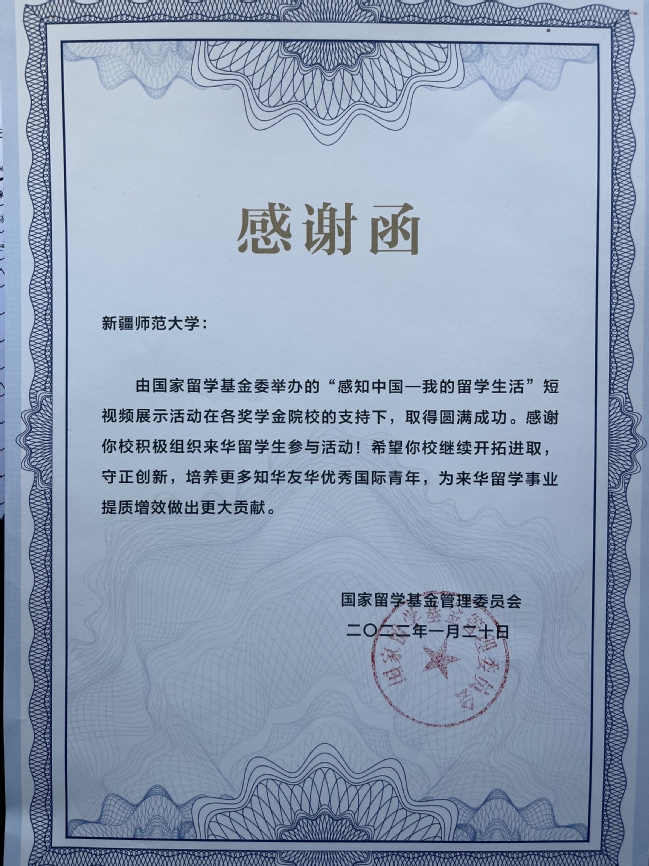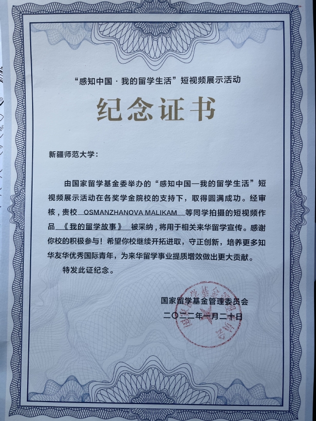 近日,国家留学基金委举办的“感知中国—我的留学生活”短视频展示活动结束评审工作,永利官网留学生OSMANZHANOVA MALIKAM所拍摄视频作品《我的留学故事》被采纳,国家留学基金管理委员会给永利官网发来纪念证书和感谢信,以表达对永利官网积极组织来华留学生参与活动的谢意。