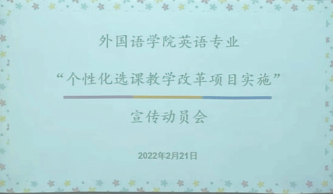 为进一步加强外国语学院英语专业建设,推进师范专业认证工作,提升人才培养质量,经过学院党委、党政联席会、校内外学科专家多轮论证,外国语学院自2022年春季学期面向2021级英语专业本科生实施个性化选课教学改革实践,2月21日下午,外国语学院组织召开教学改革实施动员会,特邀苏州大学外语教育与教师发展研究所副所长古海波博士、学校教务处副处长毋兆鹏博士参加。学院领导班子、系部主任、2021级英语专业任课教师与学业班主任及英语专业2021级全体本科生参加会议,副院长伊力米热·伊力亚斯主持。