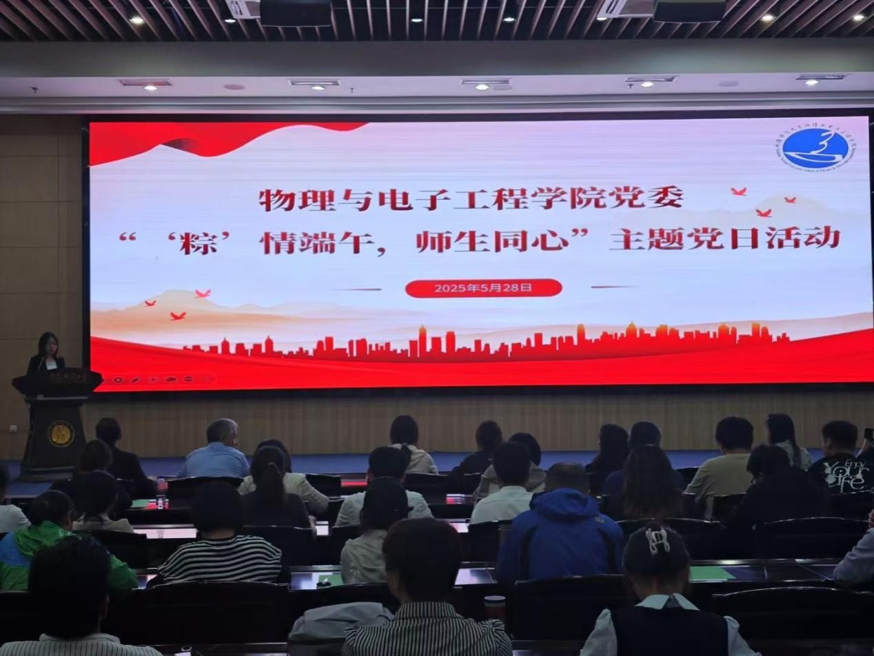 粽叶裹清风,廉韵润初心。为深入学习贯彻习近平新时代中国特色社会主义思想,弘扬中华优秀传统文化,铸牢中华民族共同体意识,深化作风建设,以廉洁文化浸润党员初心,5月28日,永利官网物理与电子工程学院党委以端午佳节为契机,在国教楼一楼报告厅组织全体师生党员开展“‘粽’情端午,师生同心”主题党日活动。活动由学院党委组织员赵海琴主持,通过“纪律教育+文化传承”的创新形式,让党建与传统节日碰撞出清廉火花。