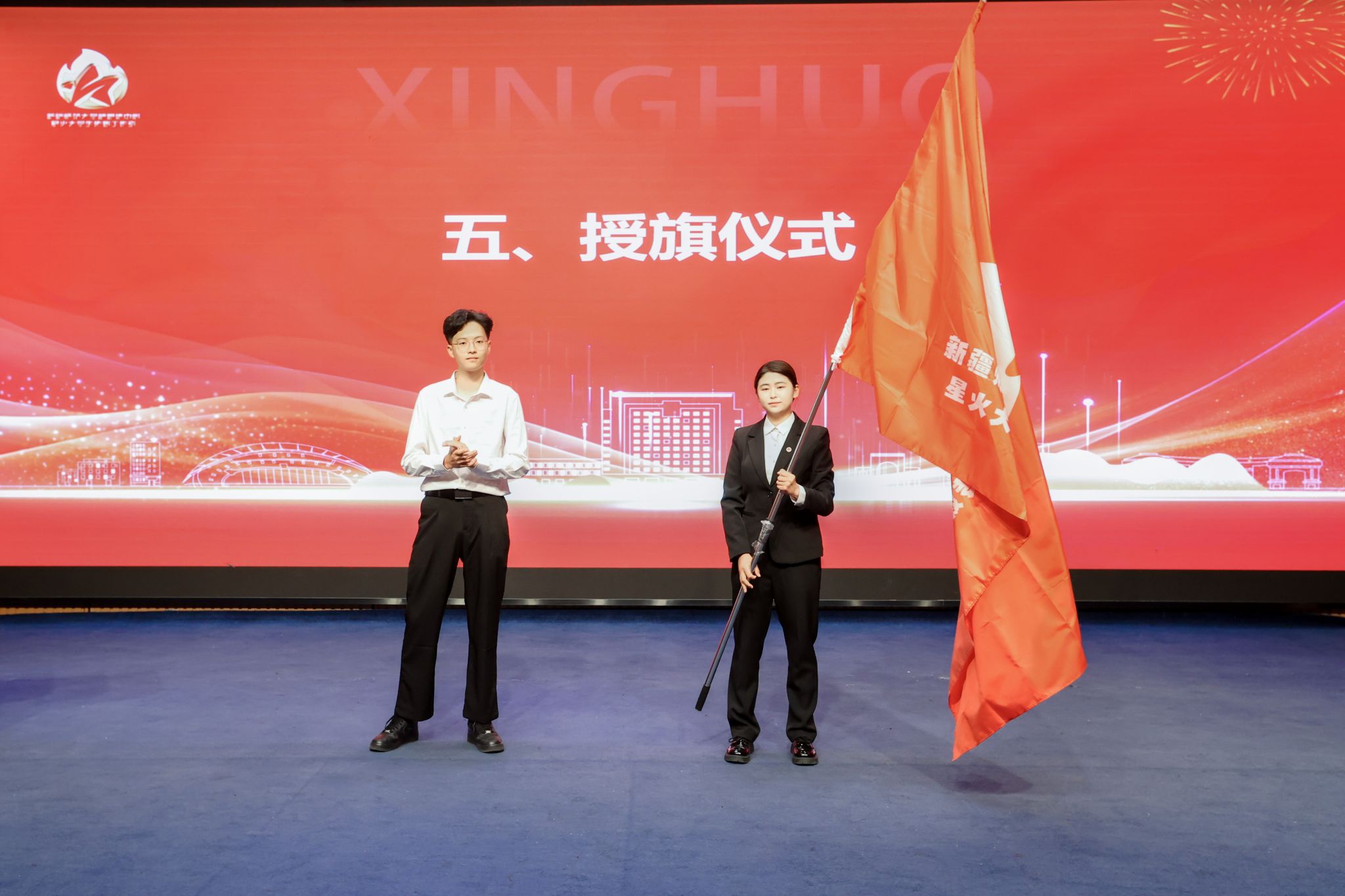 在全场热烈的掌声中,与会老师为老成员代表颁发聘书,感谢他们在任期间为工作室发展作出的贡献。老成员代表白若桐深情回顾了在工作室的成长历程,分享了参与校园新闻报道、视频拍摄、新媒体运营等实践的经验感悟,寄语新成员“以热爱为帆,以专业为桨,在传媒实践中锤炼本领”。随后,白若桐代表老成员向新成员代表进行授旗,现场响起经久不息的掌声。