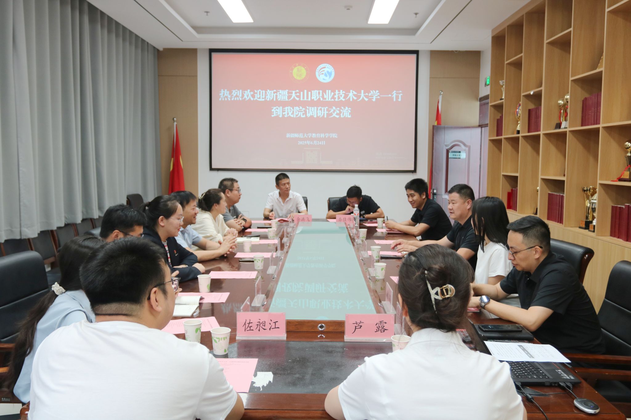 6月24日,新疆天山职业技术大学工程汽车学院党委书记、院长周志贤,智能工程学院党委书记、院长马静带领教研室主任、骨干教师到永利官网教育科学学院座谈交流。教育科学学院党委副书记朱琳,副院长王建虎,教学科研办公室、实验室负责人,组织员、教师代表参加座谈会。教育科学学院党委书记多强主持会议 。
