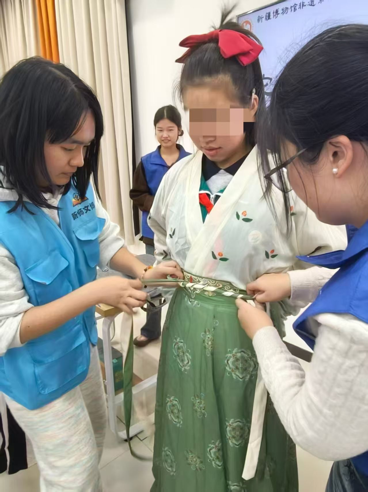 聋校学生在协会成员协助下体验汉服试穿