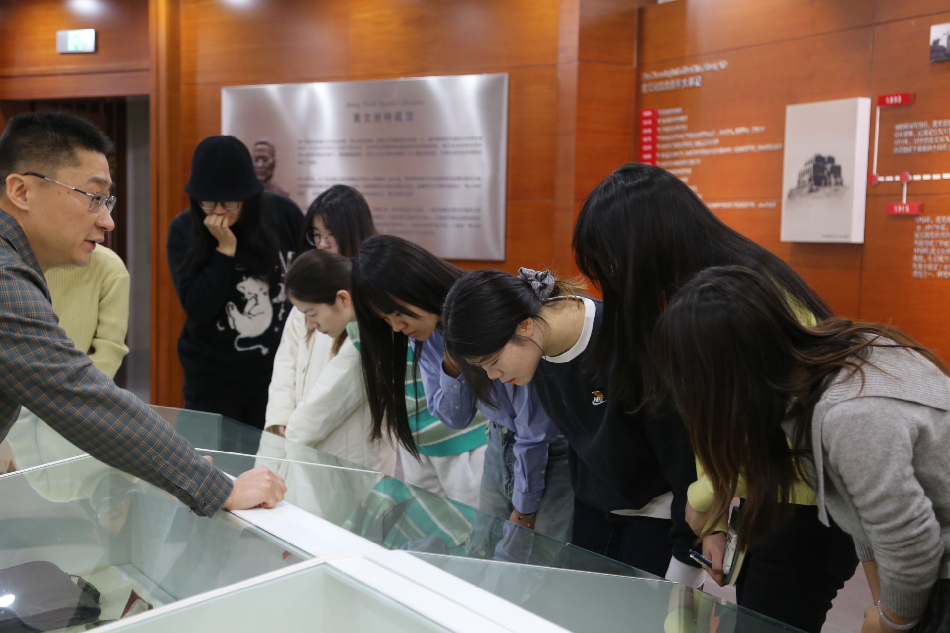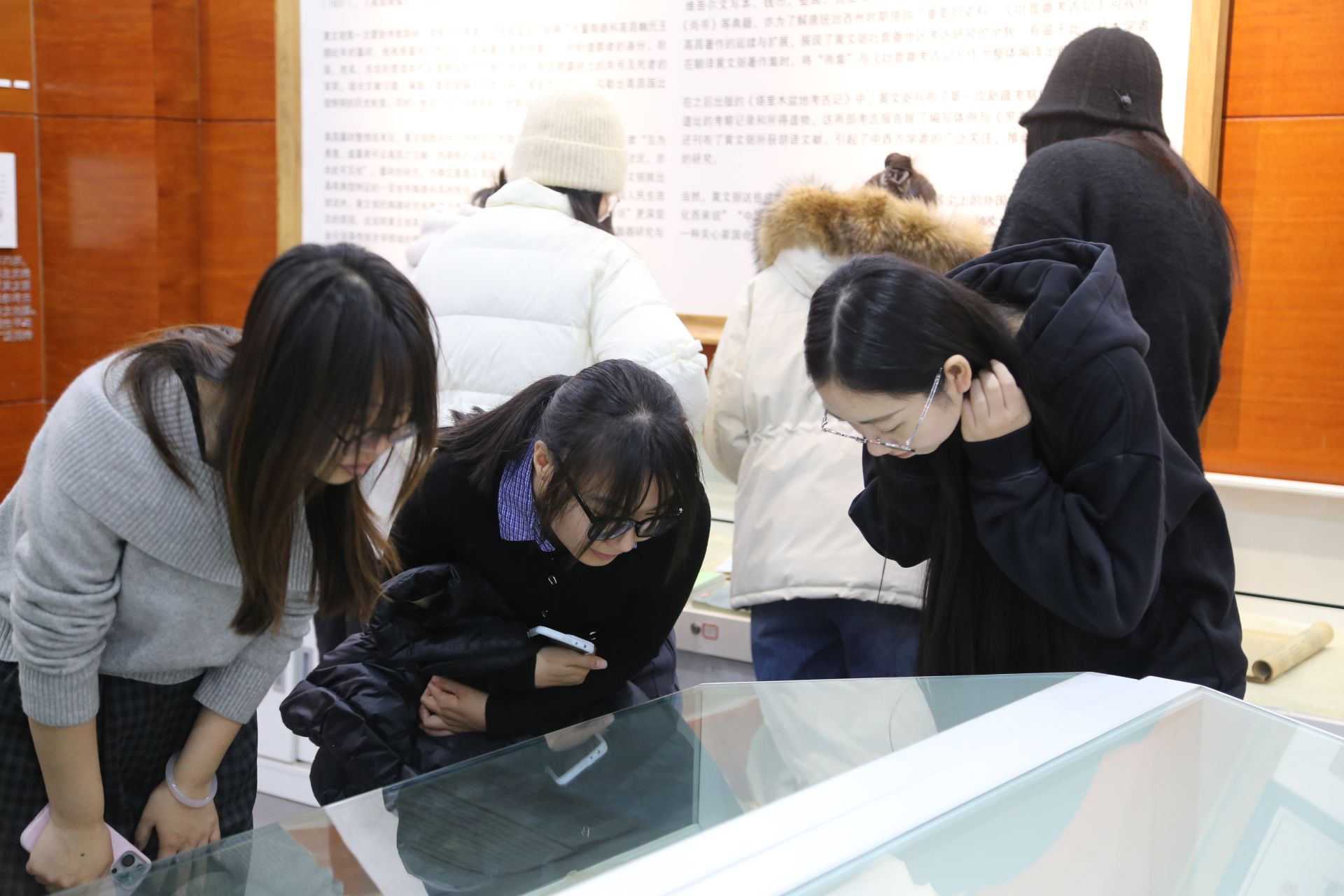 研究生第四党支部党员同志驻足于展台前观察