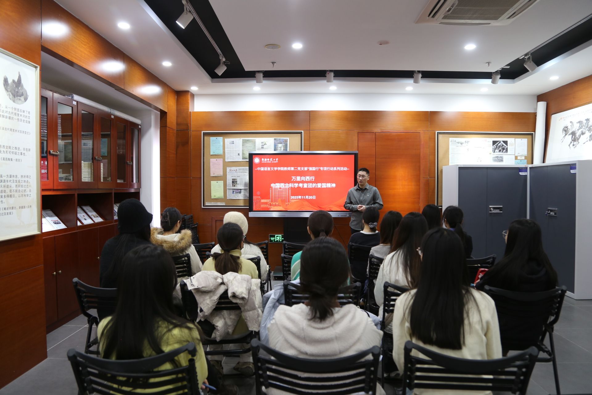 为深入学习贯彻党的二十届四中全会精神,深化全国高校“双带头人”教师党支部书记“强国行”专项行动实效,推动党建工作与理论学习、教育服务深度融合,11月20日,永利官网中国语言文学学院教师第二党支部联合研究生第四党支部在yl6809永利官网黄文弼中心组织开展全国高校“双带头人”教师党支部“强国行”专项行动系列活动。活动由研究生第四党支部书记玛迪娜·玛依拉同志主持,教师第二党支部吴华峰同志主讲,研究生第四党支部全体在校党员同志参会。